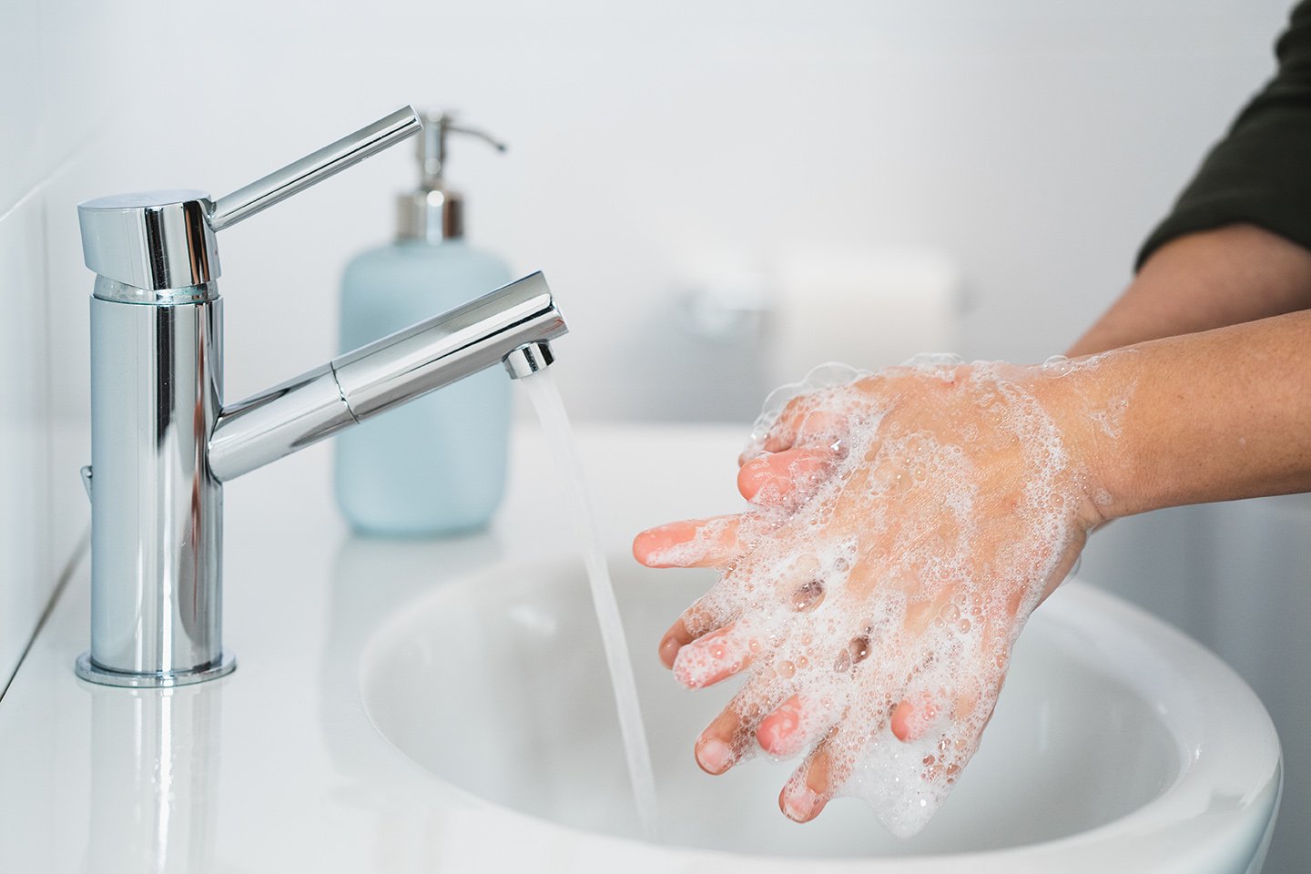 - Wet hands with clean, warm water.